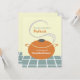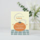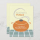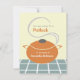 Um convite de festas de sorte com uma ilustração de um pote de cozinhar laranja com alças e tampa. Pote está sentado em uma superfície azul e branca e tem vapor vindo de baixo da tampa. Personalize o texto na frente e atrás. A parte traseira apresenta a imagem da superfície azul na parte inferior.
