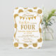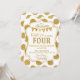 Impressão de ponto branco e dourado com aspecto brilhante com sinal de faixa de aniversário sobre um design de cartão de convite de aniversário de quatro letras douradas.