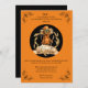 Legal convite com um espantalho que tem uma cabeça de abóbora frente e centro. Atualize todo o texto conforme necessário. A faixa central (com espantalho) lê atualmente "Hora do Partido". Preto e laranja para fazer a vibração do Halloween e faz uma apresentação divertida para potenciais convidados para a sua próxima festa de Halloween!