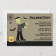 Este convite para o Festa de Halloween, 5x7, tem um tema fofo. Há uma aranha pendurada numa teia no canto, com um frankenstein caminhando com dois morcegos voando ao redor. Há um truque de abóbora ou saco de tratamento à esquerda. Você pode personalizar facilmente as informações de sua parte à direita. Copyright JD Digi Designs