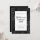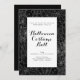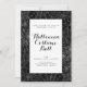 Um design para um convite do Festa de Halloween. A borda apresenta um emaranhado de teias brancas sobre um fundo preto. Na frente, você pode mudar os detalhes e as palavras "Bola de Figurino de Halloween" para se adequar ao seu evento. No verso, há muito espaço para você adicionar mais detalhes sobre sua festa de Halloween e informações de RSVP em uma fonte branca moderna em um fundo preto.