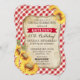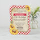 Cheque de gingham vermelho de piquenique no campo com design de cartão de convite de aniversário de girassóis.