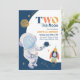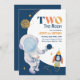 Duas da Lua! Fora deste mundo convites de festas de segundo aniversário para menino ou menina. Personalize os convites de aniversário com astronauta, foguetão, e uma lua gigante e estrelas que colocarão estrelas nos olhos da criança e dos convidados. Ilustração de lua divertida nas costas.