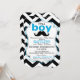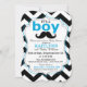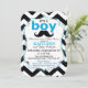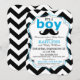 impressão de chevron preto-e-branco com texto de "garoto" em azul e bigode, design de convite para o chá de fraldas moderno.