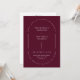 Este elegante convite de casamento minimalista apresenta um layout de na moda com texto circular lendo "gentilmente junte-se a nós para celebrar o casamento de" elegantemente colocado no topo, acrescentando um toque romântico e formal em um fundo burgundy. A sofisticada fonte serif destaca os nomes do casal com um aspecto limpo e refinado. A parte traseira da placa inclui espaço para uma foto pessoal do casal feliz e um código QR personalizável para convidados a RSVP e para encontrar mais detalhes. Tente se tornar ecológico com este convite moderno, tudo em um, ecológico, reduzindo o RSVP adicional e os cartões de detalhes. Basta adicionar seu próprio código QR à parte traseira do convite para seus convidados para RSVP e descobrir mais informações sobre seu casamento. Personalize os nomes e o texto em apenas alguns passos fáceis e personalize o cartão de convite com sua foto do casal feliz para lhe dar um toque exclusivo e pessoal. Por favor, note: as frases do texto "gentilmente juntem-se a nós para celebrar o casamento de", "recepção imediatamente após a cerimônia" na frente e "o favor da sua resposta é pedido" no verso, juntamente com as linhas e elementos gráficos trabalho de arte, não podem ser editados, apagados, movidos ou alterados. Eles estão consertados. Se precisar alterar a cor, você pode personalizar o cartão de convite. Você pode personalizar facilmente este convite com seu próprio texto e compartilhá-lo digitalmente através de texto, email ou mídia social. Como alternativa, você pode enviar uma versão impressa para seus convidados ou fazer ambos — enviar uma versão digital e acompanhar uma cópia impressa para obter uma experiência mais personalizada.