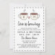 Convite de chá de noiva de casal encantador com duas xícaras de café com um coração rosa entre elas. Adicione suas iniciais às xícaras. O amor está cozinhando em uma encantadora escrita à mão. Adicione a redação e informações do convite em uma fonte organizada, em preto sobre um fundo branco.