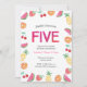 Tenha uma 5 tropical (quinta) festa de aniversário para a sua pequena! Este adorável convite de aniversário cor-de-rosa-frutado apresenta frutas de aquarelas, incluindo abacaxi, melancias, laranjas, cerejas e morangos. Todos os detalhes, incluindo (exceto idade), são personalizáveis. Outras idades também disponíveis nesta coleção.