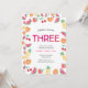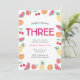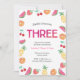 Tenha uma 3ª festa de aniversário tropical para a sua pequena! Este adorável convite de aniversário cor-de-rosa-frutado apresenta frutas de aquarelas, incluindo abacaxi, melancias, laranjas, cerejas e morangos. Todos os detalhes, incluindo (exceto idade), são personalizáveis. Outras idades também disponíveis nesta coleção.