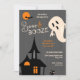 Boos e Booze Halloween Party Convidam com uma casa assombrada e um fantasma com morcego, lua de cheio e gato preto. O convite perfeito para o Dia das Bruxas e bebidas para adultos. Fácil de personalizar as informações da parte.