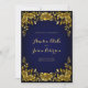Convite luxuoso com fundo azul real e um quadro de ouro talhado com flores e folhas. Este elegante modelo de convite para casamento é perfeito para convidar convidados. Basta inserir os detalhes de seu evento nesta modelo para criar um convite único.