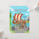 Celebre o aniversário do seu pequeno menino Viking com este convite colorido! Ele apresenta um menino guerreiro Viking com capacete com chifres, escudo de madeira e machado. Ele e alguns de seus amigos da tripulação do navio estão posando na frente de um navio longo Viking. Ao fundo, há uma paisagem escandinava e uma casa com telhado de palha Viking decorada com uma caveira e cabeças de dragão. Na frente, há um letreiro que diz FESTA, o lobo de estimação do menino e balões amarelos. É ideal para uma festa de aniversário com tema Viking! Este convite de aniversário para menino é facilmente personalizado para o seu evento, adicionando seus detalhes.