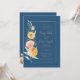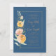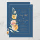 O Elegante Moderno Laranja Amarelo Azul Aquarela Floral Convites contém elegantes flores laranja e amarelas com acentos verdes e dourados brilhando sobre fundo azul. Dentro a quadro de ouro é a sua informação de convite de casamento. Parte de uma coleção projetada para você pelo Evco Studio www.zazzle.com/store/evcostudio