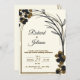 Um convite de casamento preto e branco com flores castanhas e pretas em fundo branco. O convite apresenta os nomes da noiva e noiva, Richard e Juliana, juntamente com a data, hora e local do casamento.