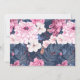 Convites de janto de aniversário elegantes com quadro botânico. Texto branco sobre um fundo azul escuro cercado por flores cor-de-rosa pinceladas.