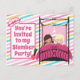 Lindos convites cor-de-rosa de festa de pijama para a festa de aniversário de uma menina. Apresenta belas listras pastéis em uma parede de quarto de criança atrás de uma linda cama cor-de-rosa e duas crianças. Personalize esses cartões-postais fofos para a noite de sono da sua criança.