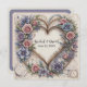 Um arranjo floral em forma de coração, intricadamente desenhado com rosas e outras flores em vários tons, está rodeado de videiras delicadas e giratórias
