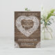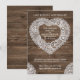 Convites de aniversário de casamento de renda rústica em coração sobre efeito de madeira. Personalize com os detalhes do seu casamento. Arte original de renda e tratamento gráfico por Sarah Trett para www.mylittleedenweddings.com no zazzle.