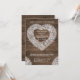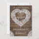 Convites de aniversário de casamento de renda rústica em coração sobre efeito de fundo de tábua de madeira. Personalize com os detalhes do seu casamento. Desenho original de arte de renda e tratamento gráfico por Sarah Trett para www.mylittleedenweddings.com no zazzle.