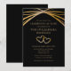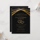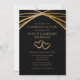 Convide amigos e familiares para uma bela festa de 50 anos de casamento com tema dourado. Personalize este convite de aniversário de casamento único e elegante com os nomes do casal, endereço do evento, horário e data da festa e mais texto editável conforme necessário. Eu criei este design original moderno de arco arredondado em tons dourados sobre fundo preto para você. Não é folha de ouro. A tipografia contemporânea simples em tom dourado pode ser editada. Os dois corações entrelaçados dão um toque romântico. O texto simples e elegante que diz "celebrando 50 anos" pode ser editado para qualquer número para um aniversário de 25 anos ou outro ano de aniversário, se necessário.