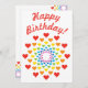 Um belo convite de aniversário, colorido, com muitos corações nas cores do arco-íris, com o texto "Parabéns". Um convite feliz e alegre para seus amados.