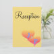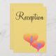 Lindos cartões de recepção de casamento com dois corações para inserir suas iniciais azul pálido monogramadas na frente em tons de pôr do sol de amarelo dourado, laranja e rosa em um lindo fundo amarelo suave com texto preto. Personalize o verso dos cartões de recepção com os detalhes do seu casamento. Design de Arte Original por TamiraZDesigns.