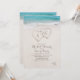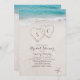 Apresenta dois corações na areia e as iniciais da noiva e do noivo com água turquesa e fundo branco de praia, convites de chá de panela de excelente para o casamento na praia de verão ou casamento de destino tropical.