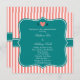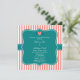 Listras cor-de-coral, cor-de-rosa, brancas, com convites para janto de ensaio. O design apresenta um padrão de listras cor-de-rosa e brancas alternadas no plano de fundo. Também a design apresenta as iniciais da noiva e do noivo separadas por um coração cor-de-rosa. Um padrão listrado elegante e no meio há uma forma lacrimogênea onde você pode adicionar o texto do seu convite.