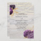 Design apresenta um elemento floral colorido impresso em tons de roxo, lavanda, ultra violeta e ameixa com floretes de pedras e linha de latido de celeiro de madeira e fio de luz. Script de caligrafia ou escrevendo de tipo. Misturar e combinar peça de coleção. Excelente para as comemorações do casamento!
