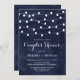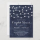 Casais elegantes e brancos convite para chás com luzes de fadas brancas suspensas sobre fundo azul marinho de cor d'água. Este convite é perfeito para eventos náuticos e ao ar livre.