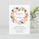 Convites florais de outono elegantes que exibem seus detalhes de casamento cercados por uma coroa de flores aquáticas, suculentos e folhas em tons de rosa-pincel, pêssego, laranja, creme, verde e marrom. Os convites de casamento florais do outono invertem-se para apresentar um fundo verde sólido.