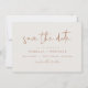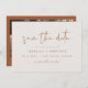 Esta opção de salvar a data apresenta uma fonte escrita à mão e um design minimalista moderno. O seu esquema de cor laranja queimada e bege, com o tom de terra boêmica, faz dele a perfeita exceção da data para o seu deserto ou boho. *A maior parte* do texto é editável e todas as cores podem ser ajustadas ao seu gosto. Adicione uma foto atrás e liste seu site de casamento para um toque especial.