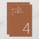 Este número da mesa de casamento apresenta uma fonte escura escrita à mão e design moderna minimalista com cor de laranja queimada boêmia. Altere facilmente o número para criar todos os números de tabela. Todas as cores são editáveis.