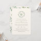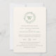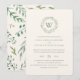 Convite de casamento simples e elegante em papel com tipografia clássica, coroa de verde com monograma pintada à aguarela.