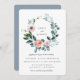 Bela coroa de folhagem de jardim e flores delicadas em aquarela, convite de casamento. Parte de trás do cartão apresenta cor azul poeirento sólido.