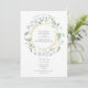 Uma grinalda decorativa de louro em aquarela circunda uma borda dourada que contém os nomes dos noivos. Abaixo, os detalhes da festa de noivado são apresentados em texto clássico e elegante. O verso apresenta os nomes do casal dentro de uma grinalda floral e dourada correspondente. Criado por Thisisnotme©