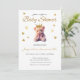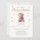 Urso com fita cor-de-rosa e convite para chá de fraldas da coroa dourada. Excelente por ser uma garota.