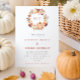 Um convite de casamento de outono bonito com uma coroa floral de aquarela com laranja terracota, roxo berinjela e flores de pêssego, decorado com uma abóbora. Personalize com seu monograma na coroa e os detalhes do seu casamento em terracota e cinza. O verso é em roxo berinjela sólido.