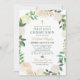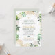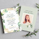 Este convite elegante para a Primeira Comunhão de uma menina apresenta uma exuberante coroa em aquarela de rosas brancas, ranúnculos e folhagens abundantes com acentos de folhas de ouro emoldurando texto personalizável e uma cruz de ouro. O verso apresenta um fundo verde sálvia suave com um espaço para foto e um buquê floral sob um cabeçalho "Deus Abençoe" em caligrafia. Toda a redação é totalmente editável para a celebração especial da sua filha.