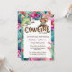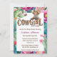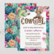 A beautiful seamless watercolor cactus pattern in green, pink, blue, teal, orange and yellow frames a white inlay that has cactus plants in green and pink with white dots on it. The word "cowgirl" which has marquee lights and brown, rusted leather on it appears near the top, with the cutest little girl sitting on top of the lettering wearing a large stetson hat. The back has the seam repeating pattern.. These are ideal for a baby shower or rustic western theme party.
