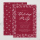 Convite para festas simples e elegante com uma fronteira de flocos de neve brancos e ramos de pinheiros em fundo de amora. "Festa de Feriado" é exibido em um script de caligrafia branco em negrito com os detalhes de sua festa mostrados abaixo. A festa de festas de neve convida a reverter para exibir um lindo padrão de flocos de neve.