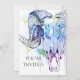 Convites de festa para todas as ocasiões fáceis de ler para você personalizar. Estes apresentam um desenho artístico de crânio de carneiro com toques geométricos aqui e ali e respingos e gotas de aquarela nas cores azul, roxo e amarelo sobre branco de um lado.