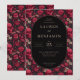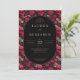 Este convite de casamento apresenta um tema gótico-romântico marcante com um padrão intricado de flores e caveiras contra um fundo preto. O design exibe vermelhos profundos, rosas suaves e cinzas escuros, criando uma atmosfera macabra, porém elegante. Uma moldura oval centraliza o texto, que é apresentado em uma fonte serifada formal, realçando a vibe tradicional de casamento, ao mesmo tempo em que adiciona um toque único e ousado. Perfeito para casais que buscam um visual memorável e distinto, este convite combina beleza com morbidade para celebrar seu dia especial.