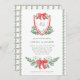 Estes incríveis convites para casamentos de férias, estilo vintage, apresentam uma design de Natal colorida e caprichosa. Uma crista vermelha brilhante com o seu monograma e um arco está rodeado por uma folhagem botânica verde-aquosa. A parte de trás do convite é decorada com fitas vermelhas e folhas verdes de Natal.