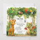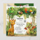 Convite de aniversário divertido para crianças com um tema de selva ou safari. Este convite apresenta animais coloridos num fundo de plantas da selva. Nas costas está uma girafa divertida olhando através de uma janela.