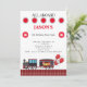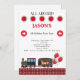Convite de aniversário de trem para crianças. Vermelho, branco e preto. Fundo branco.