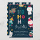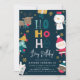 Crianças Festivas HO HO É Meu Aniversário! Convite. Design apresenta um fundo azul-marinho moderno com pequenas ilustrações festivas bonitinhas e um modelo personalizável em texto branco. Perfeito para qualquer idade e ambos os sexos.