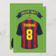 Convites de festas de aniversários temáticos de futebol com fundo verde de campo de futebol, uma camisa esportiva burgundy & blue striped com seu nome e número, uma bola de futebol e um moderno modelo.