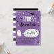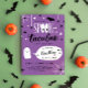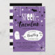 Convite de aniversário de Halloween bonito com Spooktacular escrito em uma combinação de fontes divertidas, o duplo o está em spook projetado para parecer grandes olhos. O texto está cercado por estrelas, aranhas e um morcego. E um fantasma bonito diz aos seus convidados o nome e a idade da criança de aniversário. A parte traseira apresenta faixas correspondentes em preto, branco e roxo.