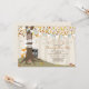 Um convite de chá de fraldas com uma ilustração de uma raposa, uma coruja, e um guaxinim em volta de uma árvore embrulhada em faixa que diz, "É um menino!" A árvore apresenta raízes expostas, folhas de outono e cogumelos. Embalagem azul e branca acima do texto personalizável.