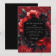 Experience a mood of dramatic romance with this elegant design. A lush arrangement of painterly blooms in shades of vibrant crimson and deep scarlet burst from a background of shadow. Dark charcoal and black foliage and flowers provide a striking contrast, creating an atmosphere of sophisticated and passionate allure for your special day.